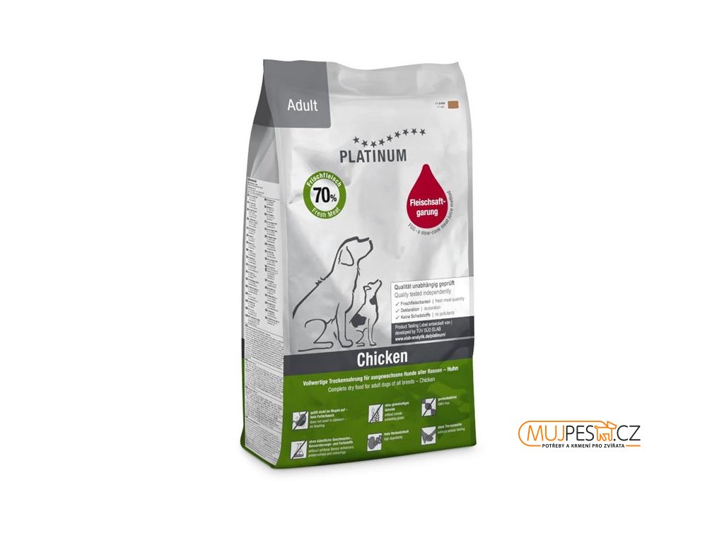 Polovlhké krmivo Platinum Adult Chicken je snadno stravitelné a psi jeho chuť milují. Splňuje nutriční požadavky pro dospělé a aktivní psy ve sportovní nebo pracovní zátěži. Vyvážené složení podporuje pevné zdraví a vitalitu. Granule jsou přirozeně bezlepkové, obsahují 70 % čerstvého kuřecího masa připravovaného unikátní metodou Fleischsaftgarung (vaření ve vlastní šťávě ve vakuu za nízkých teplot). Přidané pivovarské kvasnice podporují trávení, výtažek ze slávky zelenoústé kosti i svaly a omega-3 a omega-6 mastných kyselin kvalitu srsti. V granulích Platinum navíc nenajdete ani špetku soli, konzervanty ani umělá barviva. Granule jsou balené do alu-foliových pytlů, které zachovají čerstvost a vůni do posledního sousta.
