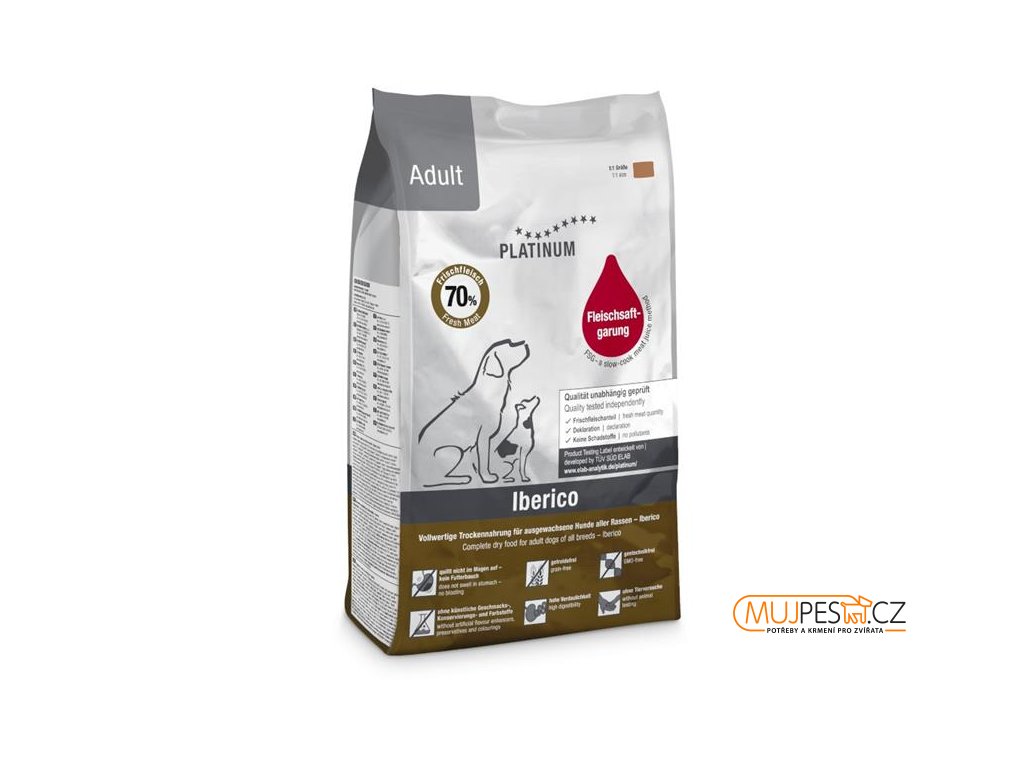 Polovlhké krmivo Platinum Adult Iberico je založené na iberském vepřovém mase, které patří mezi nejkvalitnější masa na světě. Má výraznou chuť, je šťavnaté, výživné a psi jeho chuť zbožňují. Iberská prasata jsou kříženci domácího a divokého prasete, proto se v jejich mase snoubí chuť zvěřiny s vepřovým. Pečlivě vyladěné složení navíc neobsahuje žádné obiloviny (grain-free), je přirozeně bezlepkové a hypoalergenní. Pochutnají si na něm psi s alergiemi na jiné druhy masa, psi v aktivní zátěži i vitální senioři. Receptura obsahuje také sušené rybí maso a lososový olej a má díky tomu vyvážený poměr omega-3 a omega-6 mastných kyselin. Díky jedinečné přípravě metodou Fleischsaftgarung (vaření ve vlastní šťávě ve vakuu za nízkých teplot) si navíc granule zachovávají důležité živiny, bohatou chuť i vůni. Granule jsou balené do alu-foliových pytlů, které zachovají čerstvost a vůni do posledního sousta.