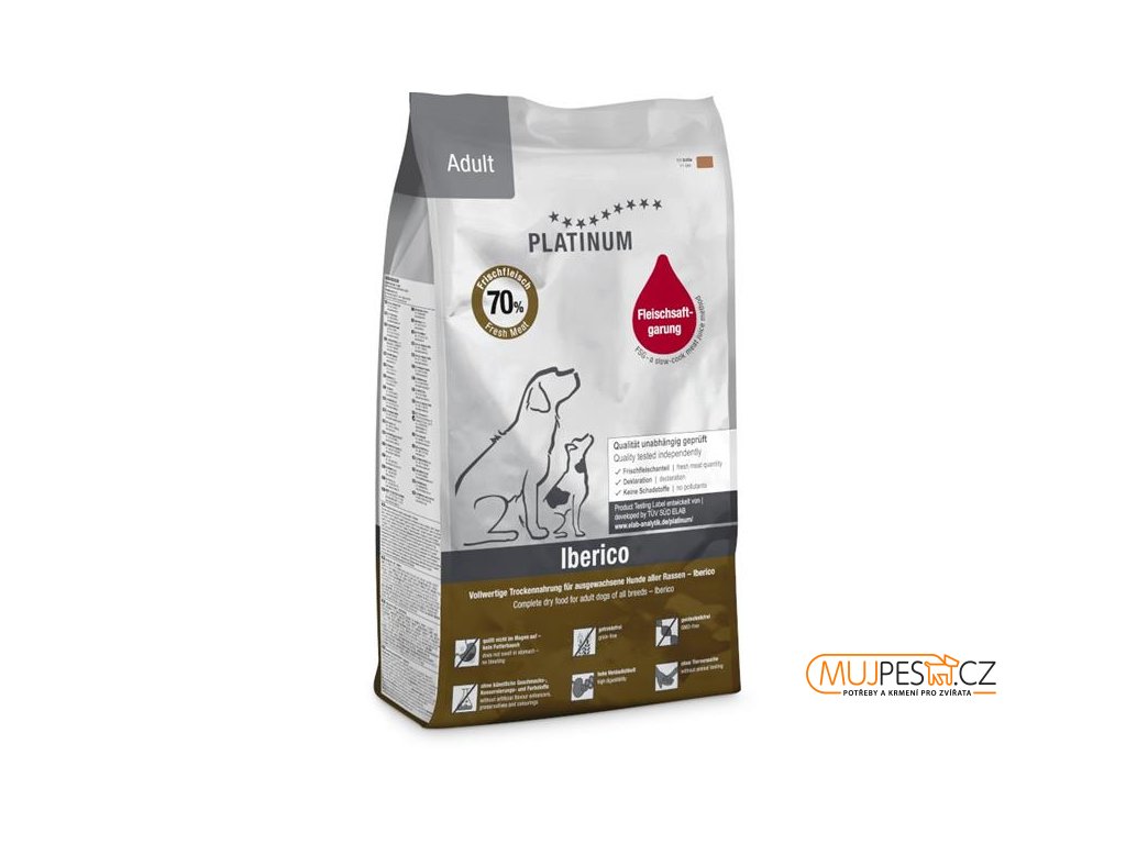 Polovlhké krmivo Platinum Adult Iberico je založené na iberském vepřovém mase, které patří mezi nejkvalitnější masa na světě. Má výraznou chuť, je šťavnaté, výživné a psi jeho chuť zbožňují. Iberská prasata jsou kříženci domácího a divokého prasete, proto se v jejich mase snoubí chuť zvěřiny s vepřovým. Pečlivě vyladěné složení navíc neobsahuje žádné obiloviny (grain-free), je přirozeně bezlepkové a hypoalergenní. Pochutnají si na něm psi s alergiemi na jiné druhy masa, psi v aktivní zátěži i vitální senioři. Receptura obsahuje také sušené rybí maso a lososový olej a má díky tomu vyvážený poměr omega-3 a omega-6 mastných kyselin. Díky jedinečné přípravě metodou Fleischsaftgarung (vaření ve vlastní šťávě ve vakuu za nízkých teplot) si navíc granule zachovávají důležité živiny, bohatou chuť i vůni. Granule jsou balené do alu-foliových pytlů, které zachovají čerstvost a vůni do posledního sousta.