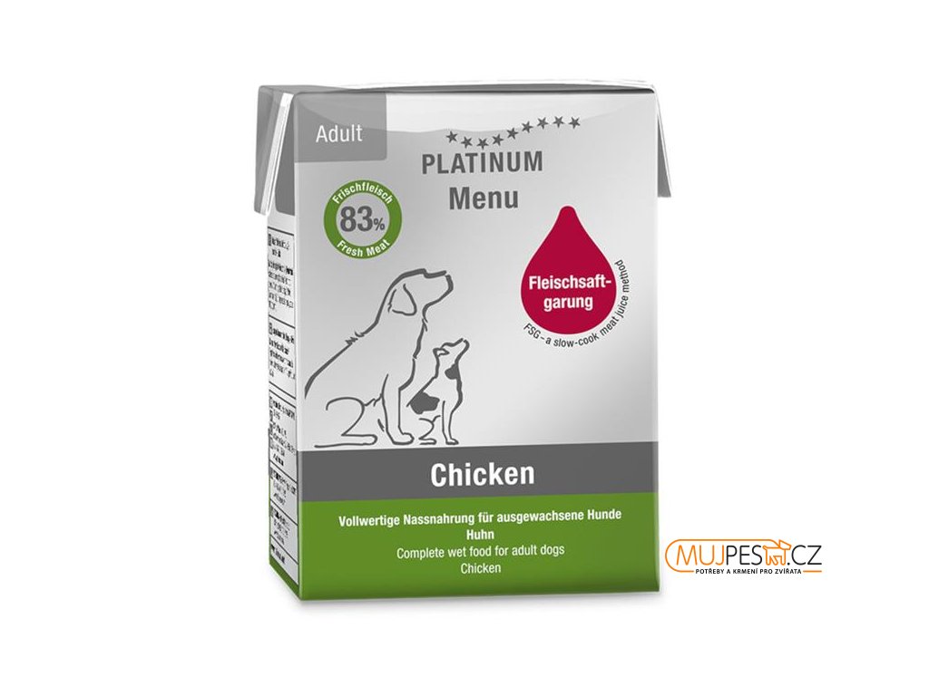 Paštika Platinum Menu Adult Chicken obsahuje 83 % čerstvého kuřecího masa. Díky jedinečné metodě přípravy Fleischsaftgarung si maso uchová plnou chuť, vůni a všechny důležité živiny. Přísady se pomalu vaří za nízkých teplot uzavřené v obalu Tetra Recart. Všechna šťáva tak zůstane uvnitř, včetně vitamínů a minerálů. Receptura s vyváženým složením vyhovuje i psům s citlivým zažíváním.