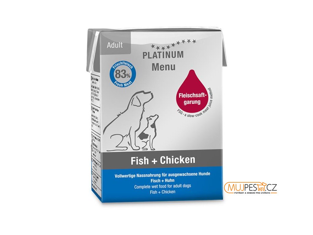 Paštika Platinum Menu Adult Fish + Chicken obsahuje 83 % čerstvého kuřecího a rybího masa z tuňáka a sardinek. Díky jedinečné metodě přípravy Fleischsaftgarung si maso uchová plnou chuť, vůni a všechny důležité živiny. Přísady se pomalu vaří za nízkých teplot uzavřené v obalu Tetra Recart. Všechna šťáva tak zůstane uvnitř, včetně vitamínů a minerálů. Receptura s vyváženým složením vyhovuje i psům s citlivým zažíváním.