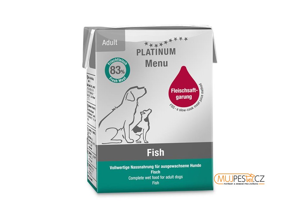 Paštika Platinum Menu Adult Fish obsahuje 83 % čerstvého rybího masa ze sardinek, tuňáka a pstruhů. Díky jedinečné metodě přípravy Fleischsaftgarung si maso uchová plnou chuť, vůni a všechny důležité živiny. Přísady se pomalu vaří za nízkých teplot uzavřené v obalu Tetra Recart. Všechna šťáva tak zůstane uvnitř, včetně vitamínů a minerálů. Receptura s vyváženým složením vyhovuje i psům s citlivým zažíváním.