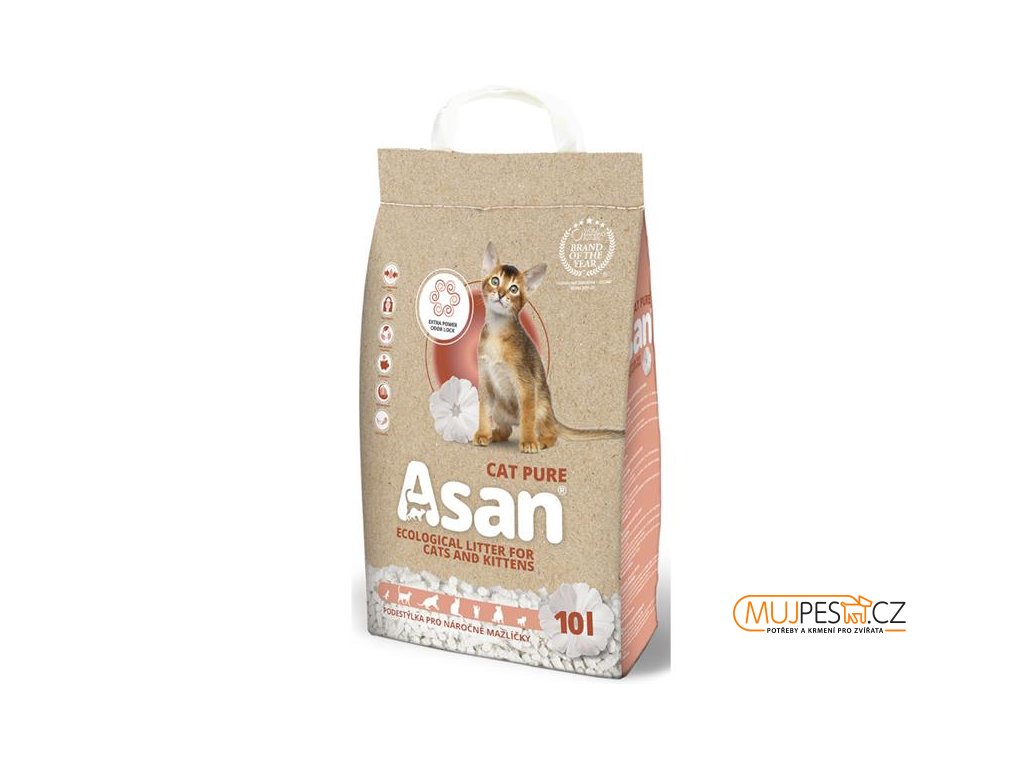 Asan Cat Pure je ekologická podestýlka pro krátkosrsté kočky a fretky s technologií absorpce pachů LAPUR. Nehrudkující stelivo je vhodné pro kočky s tradičními hygienickými návyky. Efektivně absorbuje pachy a prodlužuje tak životnost steliva v toaletě. Stelivo neobsahuje silice, parfémy a přidaná barviva.