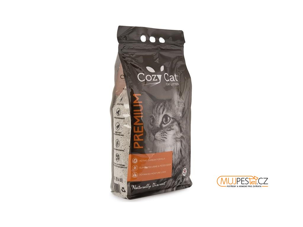 Podestýlka CozyCat Premium obsahuje aktivní uhlí, které eliminuje zápach moči a výkalů.