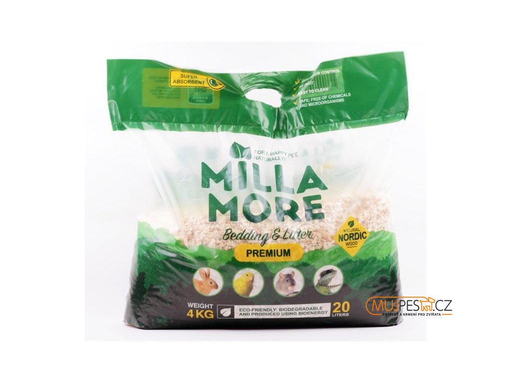 Pro podestýlání drobných savců a plazů lze kombinovat větší štěpky Premium s drobnějšími štěpkami Supersoft. Hnízdní hmota MillaMore poslouží zvířatům jako materiál pro stavbu hnízd, úkrytů i jako zábavný materiál na hraní.