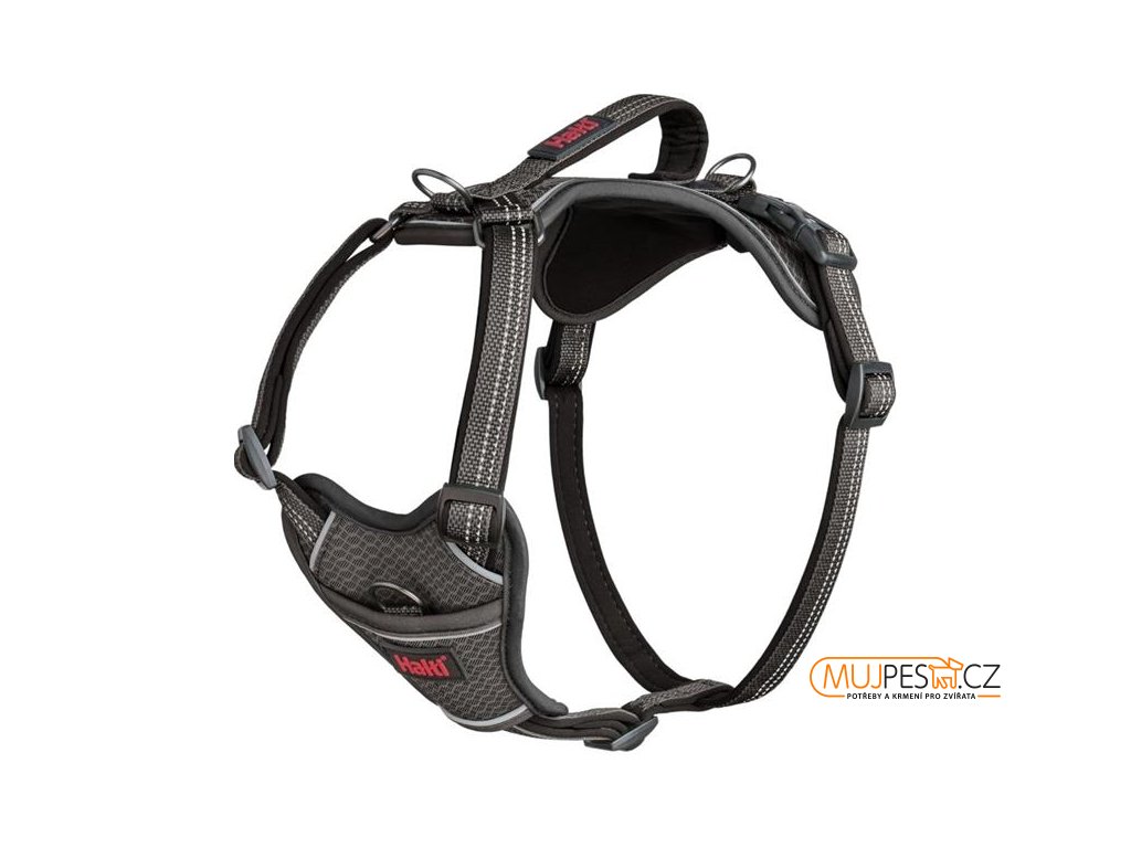 Halti Anatomy Harness je pohodlný a bezpečný postroj pro dospělé psy konstruovaný s respektem k jejich anatomii. Při jeho vývoji byly zohledněny výsledky vědeckých studií vlivu omezujících prostředků na psí zdraví. Jde o vysoce komfortní postroj vhodný jak pro běžné venčení, tak pro náročnější aktivity. Psovi zajišťuje naprostou volnost pohybu při chůzi i v běhu, žádným způsobem neomezuje pohyb ramen a rovnoměrně rozkládá tlak. Hrudní a zádový díl jsou vyklenuté, aby lépe kopírovaly psí tělo, a polstrované neoprenem pro větší pohodlí. Vodítko lze k postroji připnout na 3 místech: kroužek za krkem je ideální pro chůzi nebo pro připnutí psí známky, kroužek na zádech pro turistiku či běh a kroužek na hrudi pro regulaci tahání a skákání. Hřbetní rukojeť slouží k asistenci psovi nebo k jeho přidržení. Díky vysoce odrazivému prošití popruhů a lemování hrudního i zádového dílu je postroj reflexní ze všech stran a zvyšuje tak bezpečnost psa za zhoršené viditelnosti.
