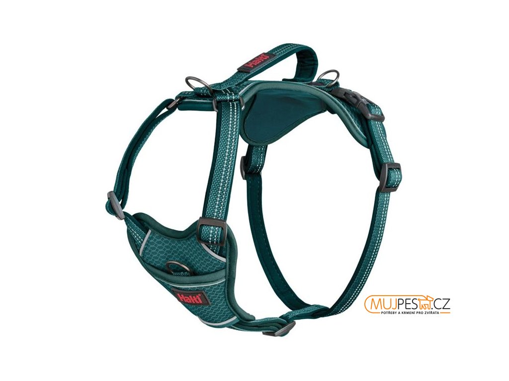 Halti Anatomy Harness je pohodlný a bezpečný postroj pro dospělé psy konstruovaný s respektem k jejich anatomii. Při jeho vývoji byly zohledněny výsledky vědeckých studií vlivu omezujících prostředků na psí zdraví. Jde o vysoce komfortní postroj vhodný jak pro běžné venčení, tak pro náročnější aktivity. Psovi zajišťuje naprostou volnost pohybu při chůzi i v běhu, žádným způsobem neomezuje pohyb ramen a rovnoměrně rozkládá tlak. Hrudní a zádový díl jsou vyklenuté, aby lépe kopírovaly psí tělo, a polstrované neoprenem pro větší pohodlí. Vodítko lze k postroji připnout na 3 místech: kroužek za krkem je ideální pro chůzi nebo pro připnutí psí známky, kroužek na zádech pro turistiku či běh a kroužek na hrudi pro regulaci tahání a skákání. Hřbetní rukojeť slouží k asistenci psovi nebo k jeho přidržení. Díky vysoce odrazivému prošití popruhů a lemování hrudního i zádového dílu je postroj reflexní ze všech stran a zvyšuje tak bezpečnost psa za zhoršené viditelnosti.