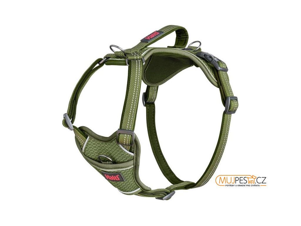 Halti Anatomy Harness je pohodlný a bezpečný postroj pro dospělé psy konstruovaný s respektem k jejich anatomii. Při jeho vývoji byly zohledněny výsledky vědeckých studií vlivu omezujících prostředků na psí zdraví. Jde o vysoce komfortní postroj vhodný jak pro běžné venčení, tak pro náročnější aktivity. Psovi zajišťuje naprostou volnost pohybu při chůzi i v běhu, žádným způsobem neomezuje pohyb ramen a rovnoměrně rozkládá tlak. Hrudní a zádový díl jsou vyklenuté, aby lépe kopírovaly psí tělo, a polstrované neoprenem pro větší pohodlí. Vodítko lze k postroji připnout na 3 místech: kroužek za krkem je ideální pro chůzi nebo pro připnutí psí známky, kroužek na zádech pro turistiku či běh a kroužek na hrudi pro regulaci tahání a skákání. Hřbetní rukojeť slouží k asistenci psovi nebo k jeho přidržení. Díky vysoce odrazivému prošití popruhů a lemování hrudního i zádového dílu je postroj reflexní ze všech stran a zvyšuje tak bezpečnost psa za zhoršené viditelnosti.