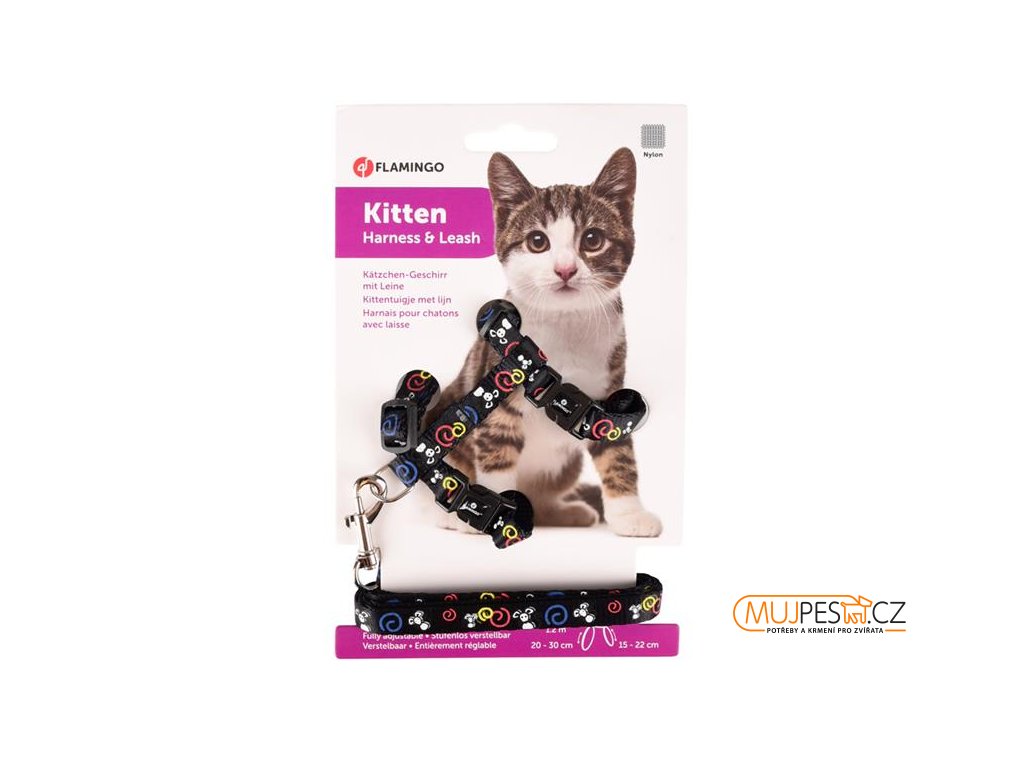 Pohodlný černý postroj s vodítkem pro koťata z nylonu. Postroj a vodítko jsou vyrobeny z měkkého nylonového materiálu s legračním motivem myší. Díky kompletní nastavitelnosti se nemusíte bát, že by postroj kočku škrtil nebo ji padal.
