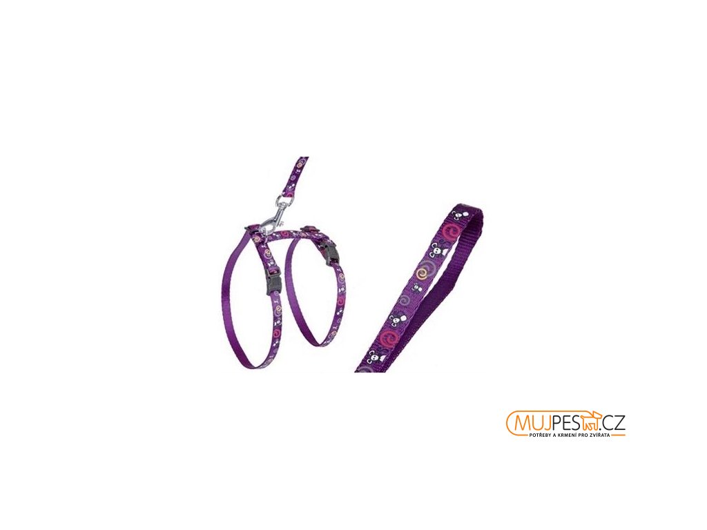 Pohodlný fialový postroj s vodítkem pro koťata z nylonu. Postroj a vodítko jsou vyrobeny z měkkého nylonového materiálu s legračním motivem myší. Díky kompletní nastavitelnosti se nemusíte bát, že by postroj kočku škrtil nebo ji padal.