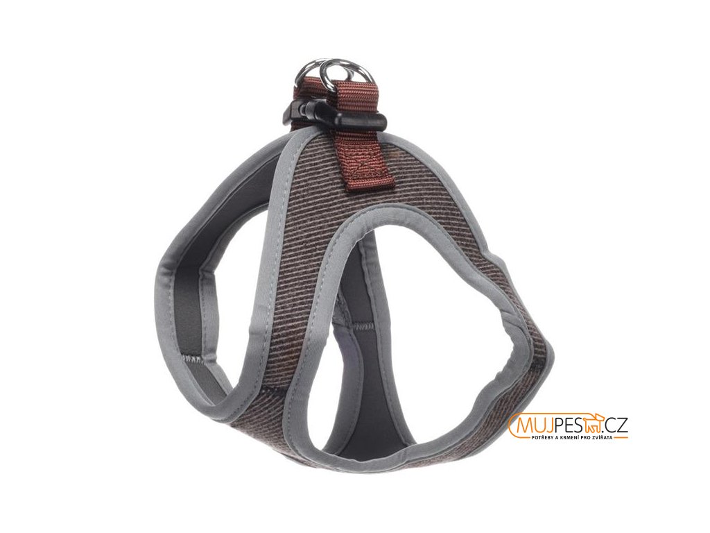 Hrudní postroj z odolného nylonu je opatřen plastovou přezkou na zapínání a dvěma chromovanými D-kroužky k připnutí vodítka. Pro větší pohodlí psa jsou okraje postroje obšité pevným lemem.