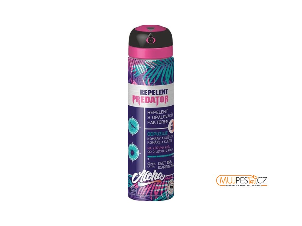PREDATOR ALOHA Repelent s ochranným faktorem 30 je aerosolový repelentní přípravek určený k odpuzování komárů. klíšťat a jiného hmyzu. Obsahuje zvýšený obsah účinných látek. Je vhodný také do exotických oblastí. Účinkuje po dobu 6-8 hodin, proto je vhodný při delším pobytu v přírodě nebo při zvýšené fyzické aktivitě. Mohou ho užívat i děti starší 2 let.