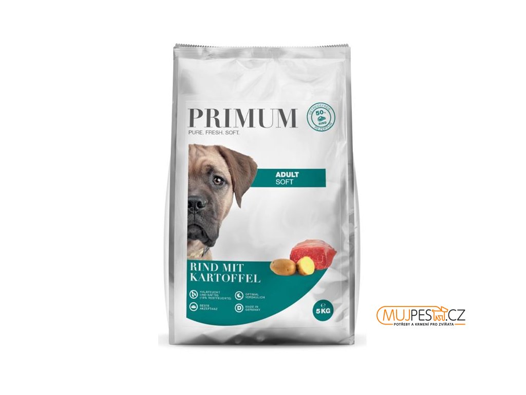Polovlhké granule Primum Adult Soft Beef obsahují čerstvé a sušené hovězí (50 %) jako jediný zdroj živočišných bílkovin a neobsahují žádné obiloviny. Ty jsou v receptuře nahrazené bramborami. Krmivo je díky tomu ideální pro dospělé psy všech plemen s citlivým zažíváním, potravinovou intolerancí nebo alergií. Kvalitní suroviny jsou vařeny pomalu a šetrně ve vlastní šťávě, díky čemuž si krmivo uchovává živiny, vysokou zbytkovou vlhkost a je vysoce chutné. Nutriční hodnotu krmiva zvyšují přidané byliny s řadou zdraví prospěšných účinků a chondroitin s glukosaminem pro podporu pohybového aparátu.