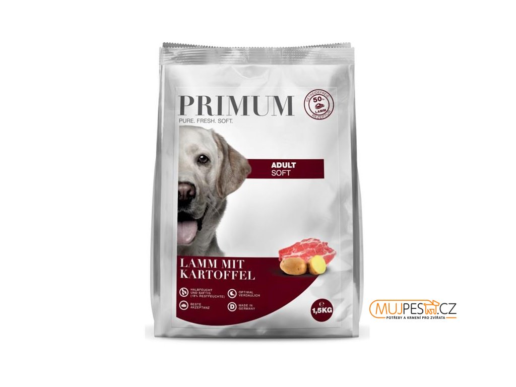 Polovlhké granule Primum Adult Soft Lamb obsahují čerstvé a sušené jehněčí (50 %) jako jediný zdroj živočišných bílkovin a neobsahují žádné obiloviny. Ty jsou v receptuře nahrazené bramborami. Krmivo je díky tomu ideální pro dospělé psy všech plemen s citlivým zažíváním, potravinovou intolerancí nebo alergií. Kvalitní suroviny jsou vařeny pomalu a šetrně ve vlastní šťávě, díky čemuž si krmivo uchovává živiny, vysokou zbytkovou vlhkost a je vysoce chutné. Nutriční hodnotu krmiva zvyšují přidané byliny s řadou zdraví prospěšných účinků a chondroitin s glukosaminem pro podporu pohybového aparátu.
