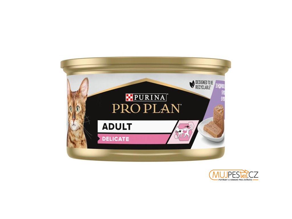 Kompletní krmivo Pro Plan Cat Adult Delicate s krůtími kousky pro dospělé kočky. Tato lahodná paštika obsahuje všechny živiny, které kočka potřebuje pro každodenní vitalitu i dlouhotrvající zdraví. Receptura s měkkými kousky krůtího masa kombinuje pečlivě vybrané suroviny, které kočce poskytnou potřebnou výživu.