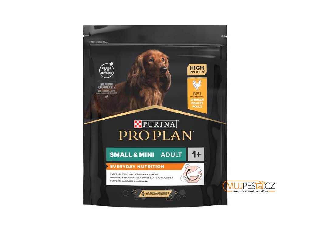 Krmivo Purina PRO PLAN® Everyday Nutrition SMALL&MINI ADULT bylo vyvinuto pro dospělé psy malých a trpasličích plemen (s hmotností do 10 kg). Granule obsahují vitamín D, minerální látky a specifické množství omega-3 mastných kyselin (0,3 %), které přispívají ke zdraví zubů a dásní. Krmivo má vysoký podíl kvalitního kuřecího, a tak zajišťuje optimální výživu psů malých a trpasličích plemen od 12 měsíců až do 9 let. Následně byste měli přejít na produkty z řady Age Defence.