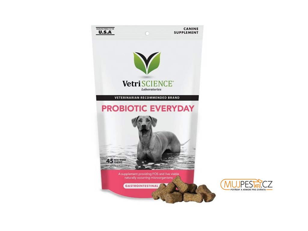 Probiotic Everyday obsahuje probiotika pro podporu zdravé střevní mikroflóry. V 1 kousku obsahuje 1 miliardu CFU patentovaných, vysoce stabilních probiotik a k tomu rozpustnou prebiotickou vlákninu. Podporuje gastrointestinální a imunitní systém. Byl navržen tak, aby mohl být používán jednak na denní bázi, ale také v dobách stresu, včetně cestování, ustájení v kotcích nebo útulcích, v období výcviku a po léčbě antibiotiky, odčervení a poruchách trávení.