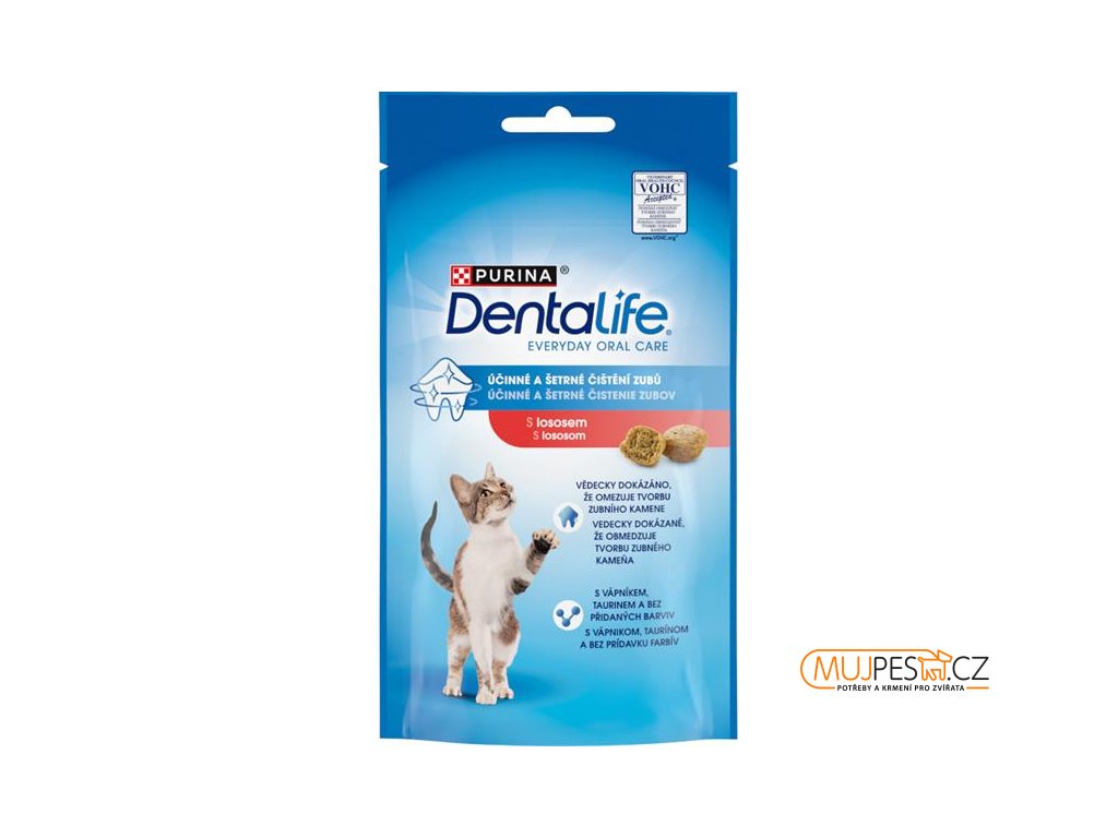 Purina DentaLife Cat Salmon je chutná dentální pochoutka, která pečuje o ústní zdraví koček každý den. Unikátní křupavá a porézní struktura čistí i hůře dostupné zuby, její tvar a složení pomáhají snižovat tvorbu zubního kamene. Vědecky ověřené složení přispívá k svěžímu dechu a zdravějším dásním. Každý kousek chutná po rybím mase, takže si kočka čištění zubů skutečně užije.