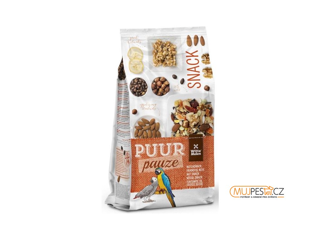 PUUR pauze Nut Snack je lahodná směs plná přírodních ingrediencí určená pro středně velké a velké papoušky. Bohatá směs s ořechy, ovocem a semeny nabízí pestrou paletu chutí pro skutečný gurmánský požitek. Papoušky potěší, zabaví a díky obsahu aminokyselin (methioninu a cysteinu) také podpoří kvalitu jejich peří.