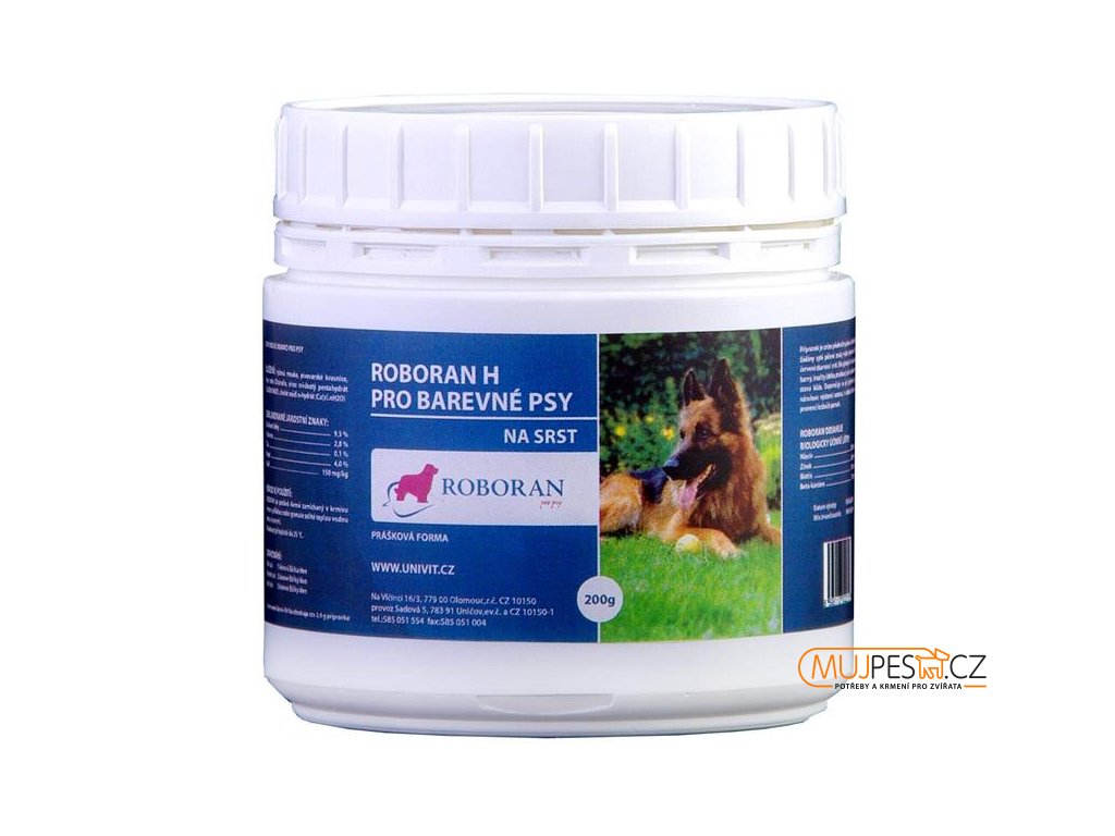 Roboran H pro barevné psy - doplněk biologicky účinných látek pro psy. Vhodnou kombinací komponent je dosaženo výrazného zlepšení kvality a zbarvení srsti a zdravotního stavu kůže. Obsahuje chuťový doplněk, pro který jej psi rádi přijímají.