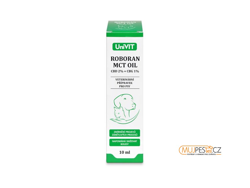 Veterinární přípravek Roboran MCT oil CBD je v tekuté formě a dávkuje se po kapkách. Účinné látky pochází z konopí. Tyto látky jsou speciálně smíchány s MCT olejem, který se získává z kokosového oleje a je velmi šetrný k tělu. MCT olej pomáhá snižovat hladinu krevního cukru a působí na zlepšení paměti.