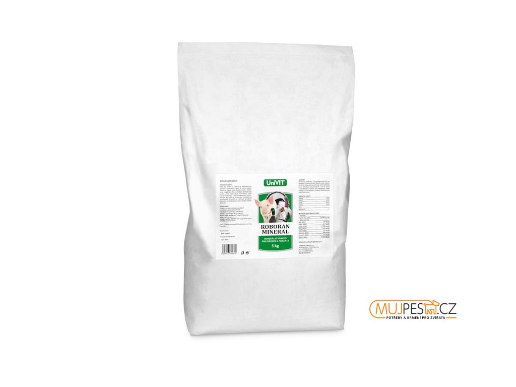 Roboran MINERAL je minerální suplement určený pro drůbež (slepice a kuřata, krůty a krůťata, kachny a kachňata, husy a housata) a prasata a selata ke každodennímu doplnění minerálních látek do krmné dávky.