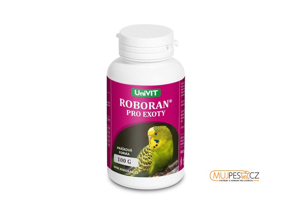 Roboran pro exoty je doplňkový vitamino-minerální přípravek, který jak složením, tak vzájemným poměrem jednotlivých složek odpovídá potřebám okrasného ptactva. Je vhodný k preventivnímu dietetickému doplnění a biologickému vyvážení neplnohodnotné krmné dávky. Působí na zvýšení odolnosti a ke zlepšení celkové tělesné kondice, hlavně v zimním a jarním období, v období hnízdění a při stresových stavech.