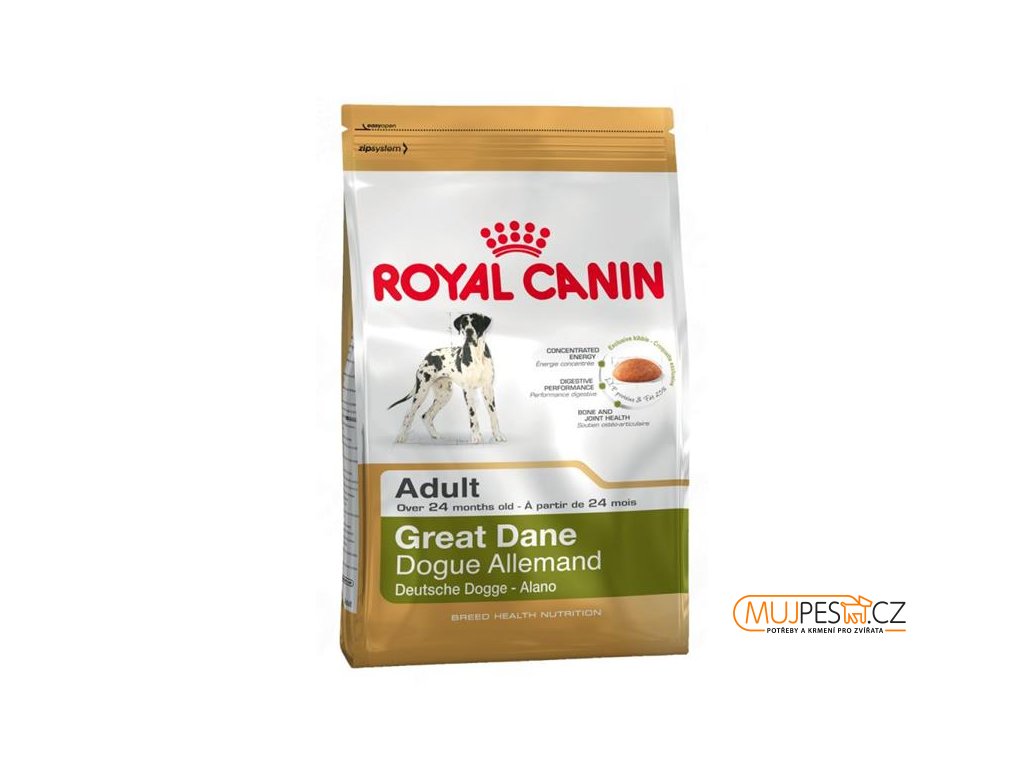 Kompletní krmivo pro dospělé a stárnoucí psy plemene německá doga - nad 24 měsíců. Speciální granule s vysokým energetickým obsahem (25% tuků) odpovídají energetickým požadavkům německé dogy, aniž by přetěžovaly její žaludek. Jejich tvar, velikost a struktura podporují kousání, zpomalují rychlost přijímání potravy, posilují zuby a zlepšují ústní hygienu.