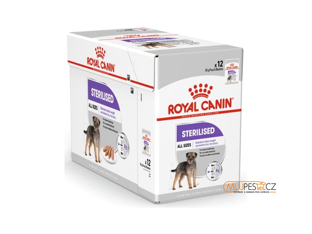 Kapsičky Royal Canin Sterilised jsou určené pro kastrované dospělé psy všech plemen a velikostí od 10 měsíců věku a jsou vhodné také pro psy se sklonem k nadváze. Kompletní krmivo ve formě chutné paštiky pomáhá zamezit nárůstu hmotnosti psa.