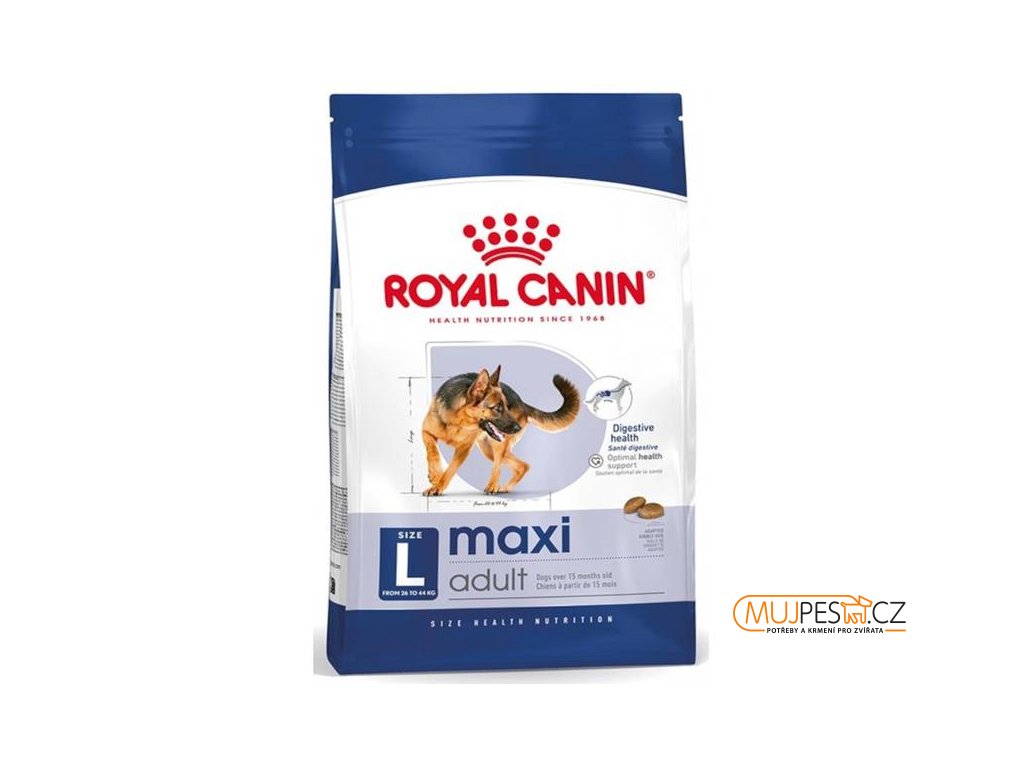 ROYAL CANIN® Maxi Adult je nutričně kompletní a vyvážená receptura navržená tak, aby splňovala specifické potřeby velkých psů (26–44 kg) po celou dobu jejich dospělosti od 15 měsíců do 5 let. Větší psi jsou z důvodu delšího trávicího traktu ve srovnání s menšími plemeny náchylnější k zažívacím potížím. Granule proto obsahují vyvážený poměr vysoce stravitelné bílkoviny a vlákniny, který prospívá trávicímu traktu. Větší psi také více zatěžují kloubní aparát. Receptura proto obsahuje kombinací minerálů a živin, které podporují zdraví kostí a kloubů. Směs vitamínů a vysoce kvalitních živin s maximální vstřebatelností podporuje celkovou kondici. Tvar a velikost granulí jsou uzpůsobené tak, aby psa povzbudily k důkladnému žvýkání potravy.