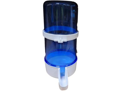 Plastová napáječka na vodu pro papoušky s úzkým pítkem. Napáječku lze zasunout mezi kolmé dráty klece.