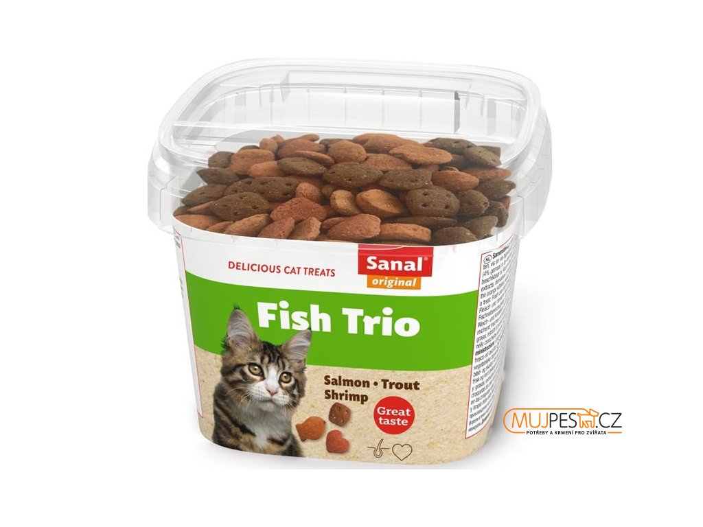 Složení: obiloviny, maso a výrobky živočišného původu, oleje a tuky, bílkovinné extrakty rostlinného původu, vedlejší výrobky rostlinného původu, ryby a vedlejší výrobky z ryb (4% pstruh v tmavě hnědých kouscích, 4% losos v oranžových kouscích), kvasnice, měkkýši a korýši (4% krevet v červených kouscích), minerální látky.