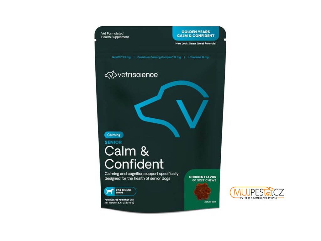 Calm & Confident je speciálně vyvinut pro starší psy, aby pomohl zvládnout problémy stárnutí související s chováním zvířete, jako je například zmatenost či dezorientace. Klíčové složky Směs biopeptidů Colostrum Calming Complex® a čajový extrakt napomáhají podpoře kognitivních funkcí a klidného chování. Je klinicky prokázáno, že patentovaná forma fosfatidylserinu (Sharp-PS® Green) podporuje správnou funkci mozku, paměť a učení u stárnoucích psů. Pamlsky s příchutí kuřecích jater se snadno rozdělí na kousky a jsou vhodné pro psy s citlivým zažíváním.