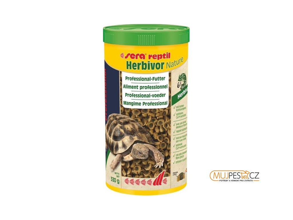 Sera Reptil Professional Herbivor je jedinečné koextrudované doplňkové krmivo pro býložravé plazy jako jsou suchozemské želvy nebo leguány. Prstenec obsahuje směs bylin s více než 20 pečlivě vybranými bylinami z přirozeného výživového spektra evropských suchozemských želv. Doplněny jsou kvalitními rostlinnými bílkovinami a tuky. V jádru krmiva jsou životnědůležité vitamíny – šetrně zpracované za nízkých teplot – a minerální látky jakož i řasy k posílení imunity. Základem pro zdravý vývoj kostí a krunýře je optimální poměr vápníku/fosforu.