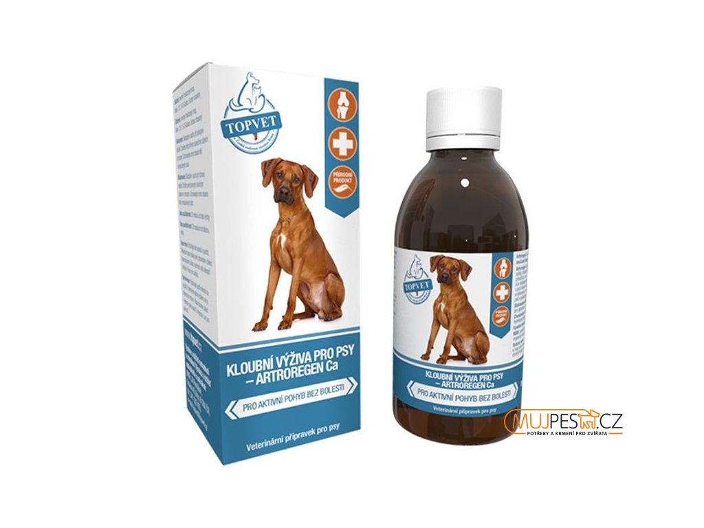 Artroregen Ca - originální receptura spojuje chondroprotektivní stavební látky (glukosamin sulfát, chondroitin sulfát) a unikátní bylinný komplex (šišák bajkalský, bršlice kozí noha, přeslička rolní nať, rdesno nať). O výše uvedených surovinách je historicky známo a je dohledatelné v literatuře, že jsou vhodné k preventivnímu a regeneračnímu použití u psů všech věkových kategorií. Zmírňuje bolest poškozených kloubů a zlepšuje hybnost a výkonnost. Doporučujeme užívat preventivně od 3 měsíců věku a jako podporu terapie psů s poškozenými klouby.