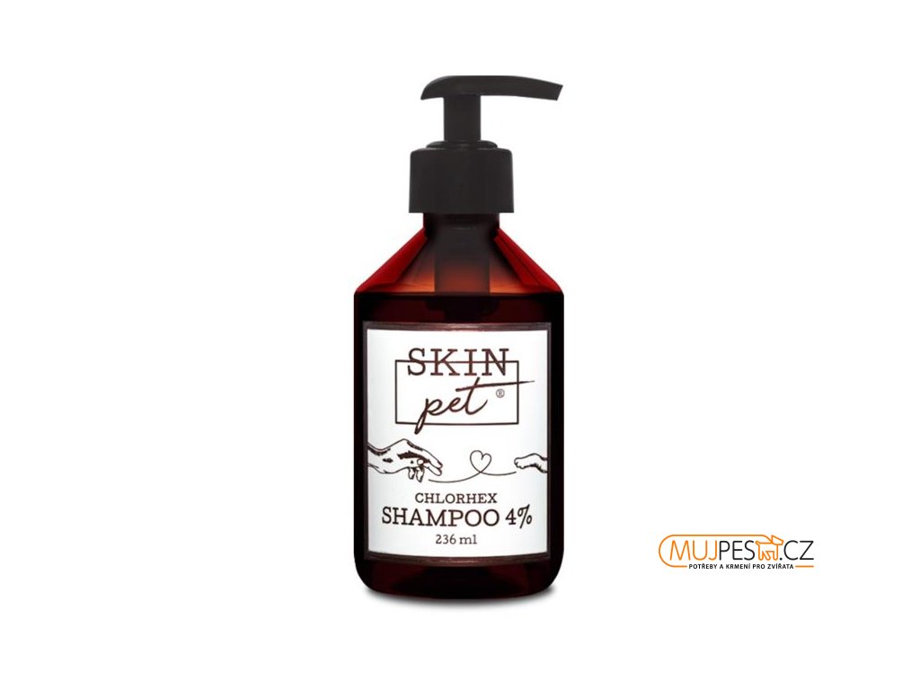Veterinární přípravek SkinPET® Chlorhex Shampoo 4% je určený především pro krátkodobou akutní péči po operacích, úrazech nebo při infekcích kůže a jiných kožních potížích (dermatitida) psů, koček a koní. Šampon díky šetrnému složení neštípe, nedráždí a nevyvolává alergie. Antiseptické látky snižují mikrobiální zátěž a riziko infekce. Šampon šetrně čistí, eliminuje zápach a navrací srsti i pokožce přirozený lesk. Neobsahuje pěnivé složky, které jsou častou příčinou svědění a podráždění citlivé pokožky zvířat. Neobsahuje ani silné parfemace, na které mohou být zvířata citlivá. Chemické vůně navíc mohou vyvolat podráždění, ekzém či alergickou reakci. Šampon SkinPET® obsahuje pouze přirozenou a jemnou vůni Green Tea.