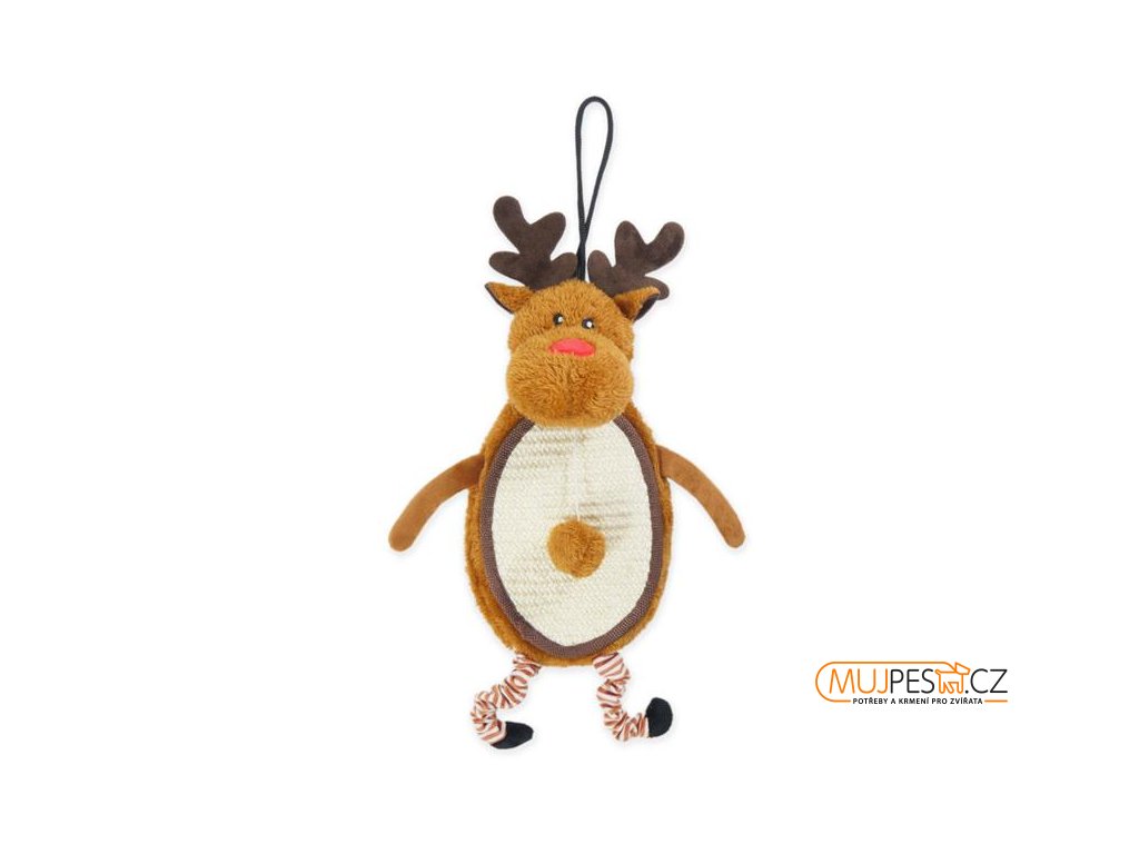 Nástěnné škrabadlo v podobě soba láká kočky sisalovou škrabací plochou, elastickýma nohama a plyšovou bambulkou na provázku. Hračka má poutko pro zavěšení.
