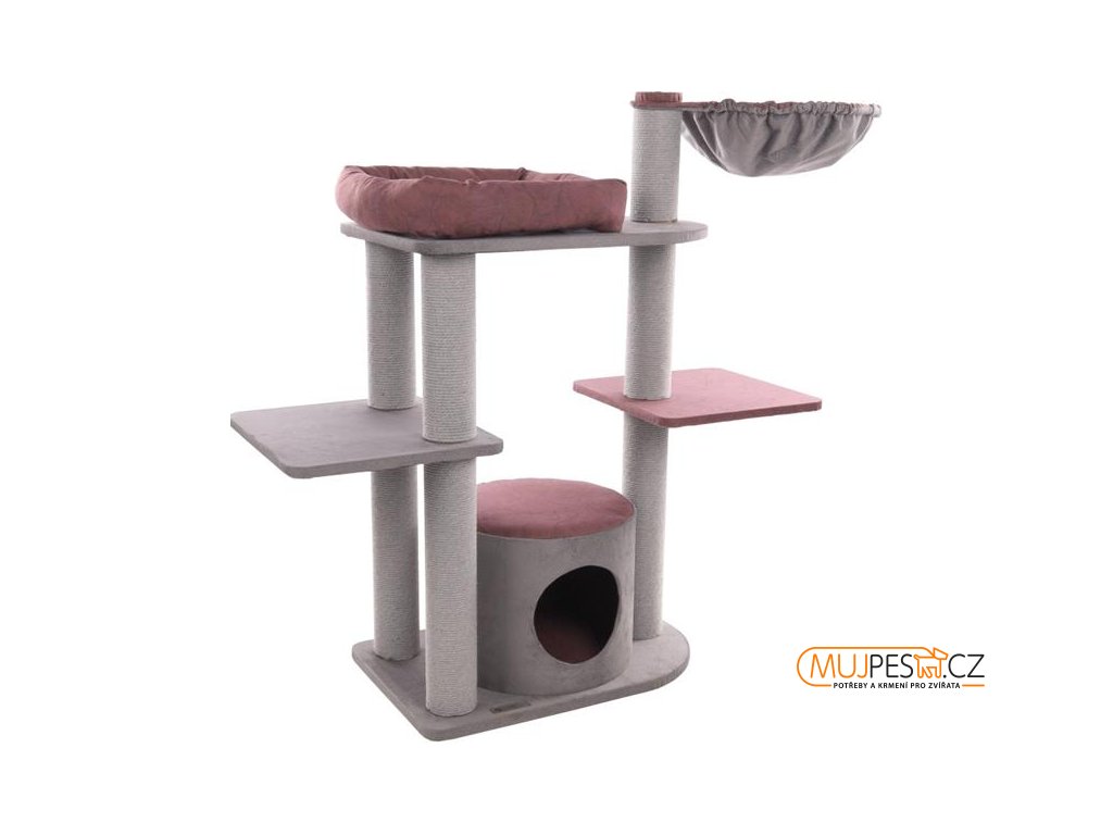 Velké škrabadlo pro kočky v šedé barvě s pelíškem na odpočívání. Škrabadlo obsahuje hamaku, dvě polstrované plošiny na odpočívání a domeček. Domeček a plošiny jsou z vnitřní strany a zespodu potažené látkou. Odnímatelný domeček je zajištěn pomocí suchého zipu.