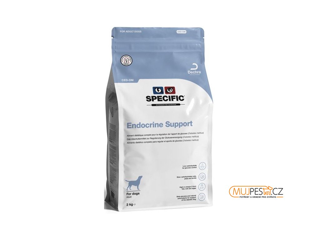 - Endokrinní poruchy pozorujeme typicky u psů ve středním věku či starších psů. SPECIFICTM CED Endocrine Support je vyrobena tak, aby splňovala výživové požadavky psů právě těchto kategorií. Mírně snížený obsah fosforu a sodíku podporuje správné fungování ledvin a přídavek taurinu a L-karnitinu dobrou funkci srdce.