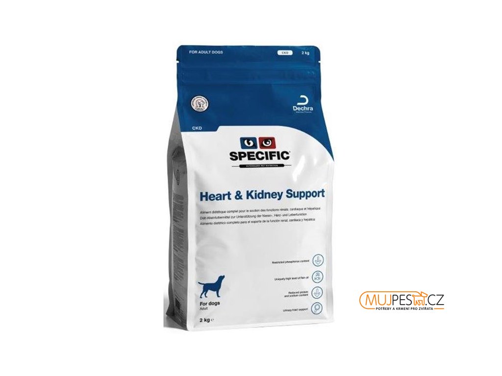 SPECIFIC® Heart & Kidney Support je kompletní dietní krmivo pro podporu funkce ledvin, srdce a jater u dospělých psů trpících chronickou ledvinovou, srdeční a/nebo jaterní nedostatečností. Tato dieta má nízký obsah fosforu a sodíku a omezený obsah proteinů s vysokou kvalitou a stravitelností. Má vysoký obsah esenciálních mastných kyselin (včetně omega-3 mastných kyselin z rybího oleje) a schopnost okyselovat moč. Tato dieta pokrývá veškeré výživové potřeby dospělých psů a přispívá k jejich zdraví.