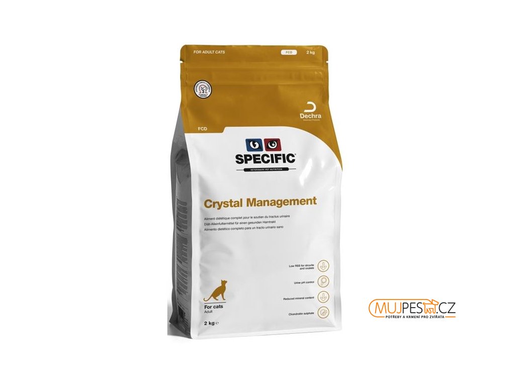 SPECIFIC® Crystal Management je kompletní dietní krmivo, které rozpouští struvitové močové kameny a snižuje riziko recidivy vzniku struvitových kamenů a onemocnění dolních cest močových u koček. Dietní krmivo díky svým vlastnostem okyseluje moč a snižuje nasycenost moči, čímž brání tvorbě struvitových krystalů. Speciální krmivo pokrývá všechny požadavky na výživu dospělých koček a přispívá k jejich zdraví.