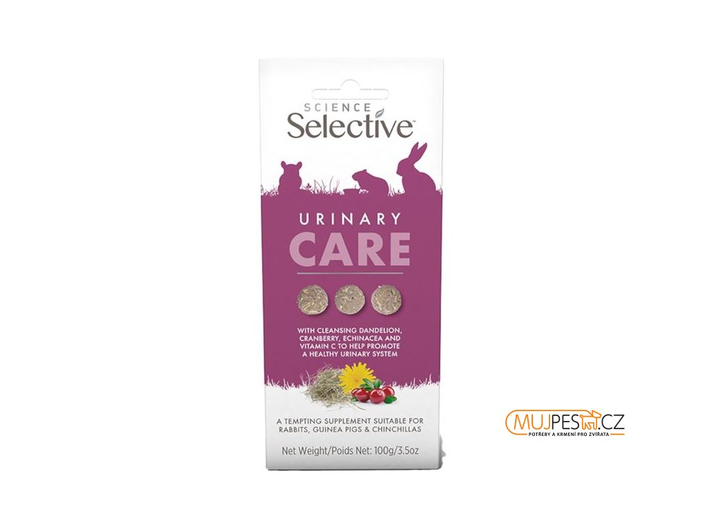 Chutné pamlsky Science Selective Urinary Care obsahují lněné semínko, pampelišku, brusinky, echinaceu a vitamín C. Pomáhají podporovat zdraví močových cest u králíků, morčat a činčil se sklony k zánětům nebo infekcím močových cest a ledvin a k tvorbě močových kamenů. Pamlsky jsou ideální pro krmení z ruky – k navázání či prohloubení vztahu s drobným mazlíčkem. Složení je čistě přírodní, bez umělých barviv, příchutí a přidaných cukrů.