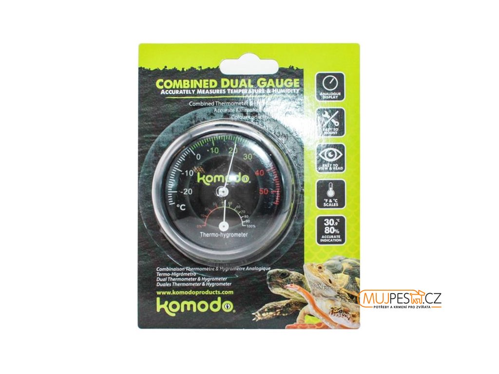 Sledování teploty a vlhkosti v teráriu je nezbytné pro úspěšný chov jakéhokoli terarijního zvířete. Kombinovaný teploměr a vlhkoměr Komodo s analogovým displejem má vše, co k tomu potřebujete.