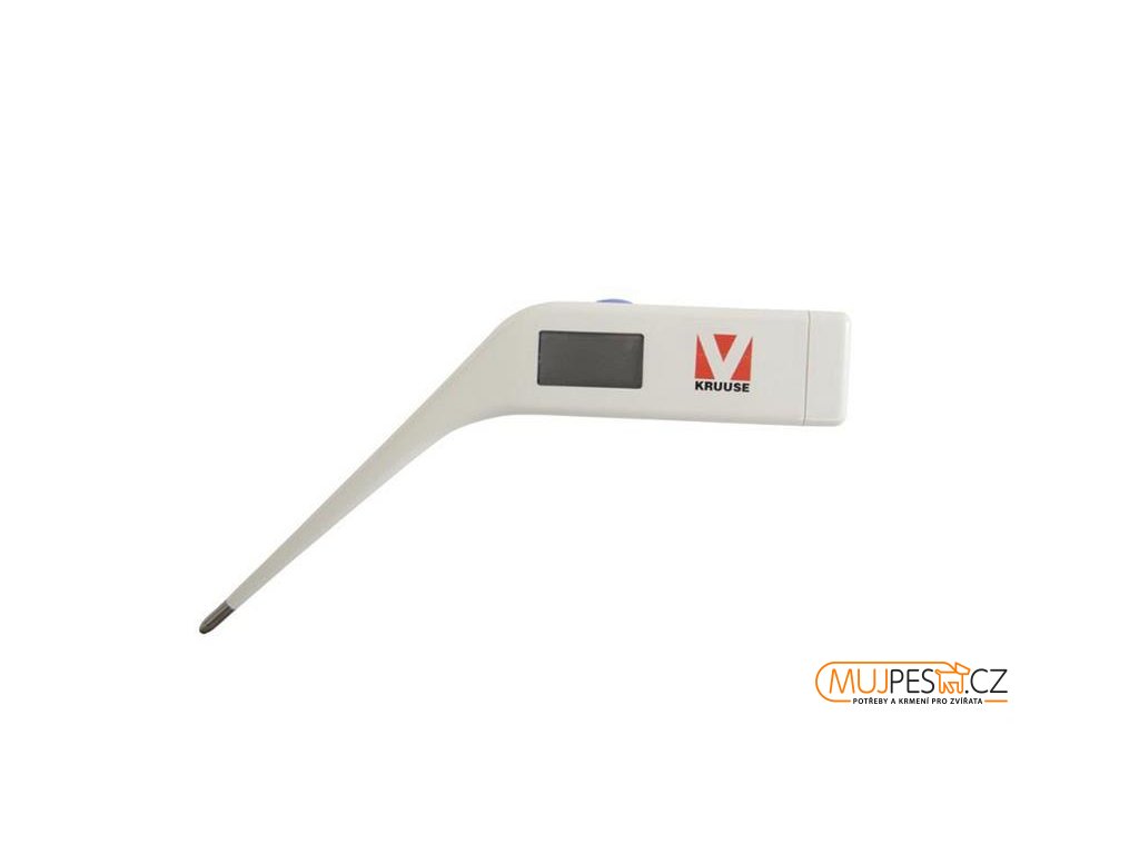 Digitální teploměr se zahnutou měřící částí určený pro měření rektální teploty u zvířat.
