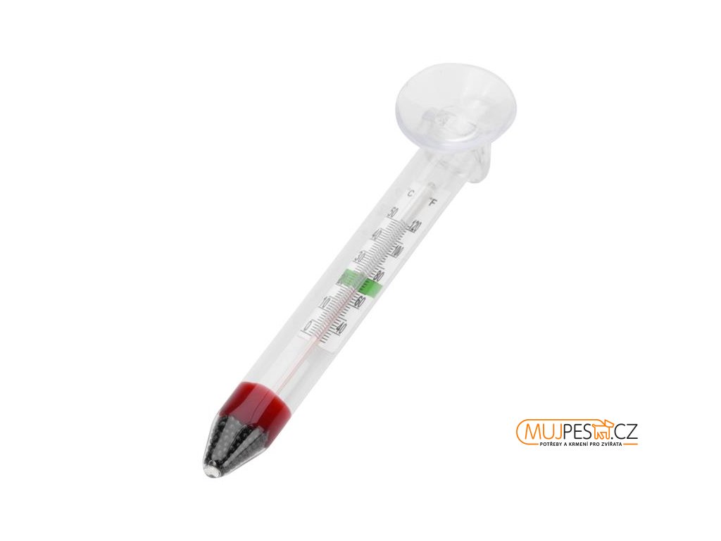 Skleněný teploměr s přísavkou pro snadné uchycení v akváriu.