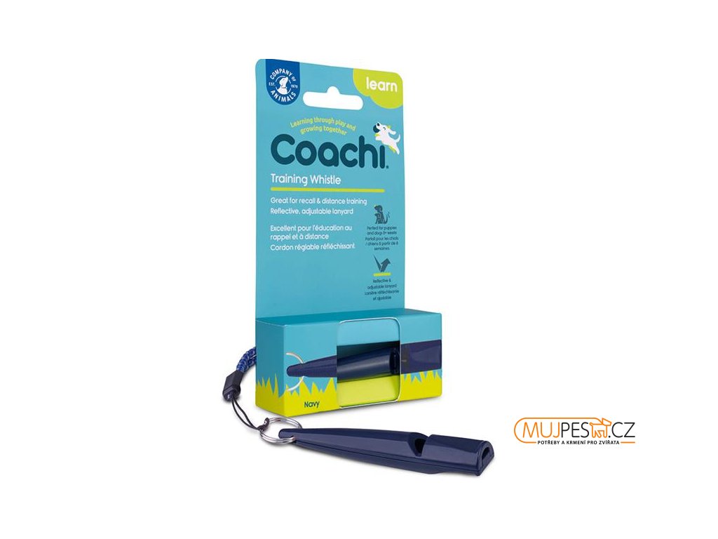 Coachi Training Whistle je univerzální píšťalka vhodná pro běžný výcvik štěňat a dospělých psů. Je velmi lehká, odolná a opatřená reflexním provázkem s nastavitelnou délkou pro zavěšení na krk nebo na zápěstí. Vydává čistý, silný a přesný tón, dobře slyšitelný na dálku.