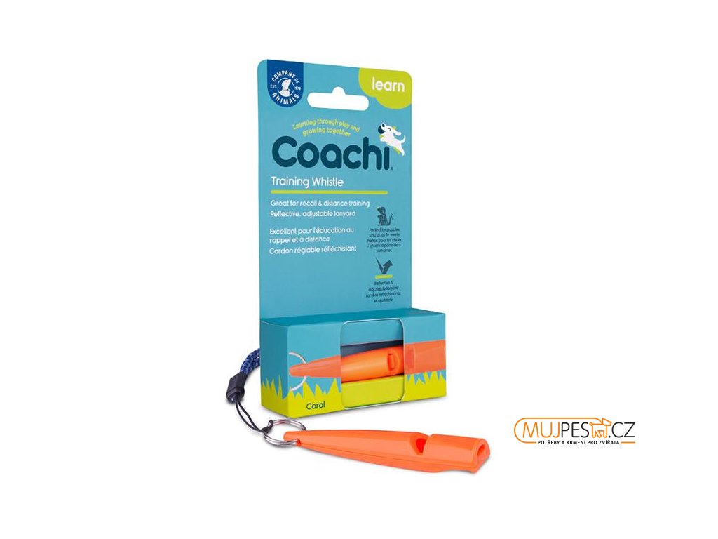 Coachi Training Whistle je univerzální píšťalka vhodná pro běžný výcvik štěňat a dospělých psů. Je velmi lehká, odolná a opatřená reflexním provázkem s nastavitelnou délkou pro pověšení na krk nebo na zápěstí. Vydává čistý, silný a přesný tón, dobře slyšitelný na dálku.