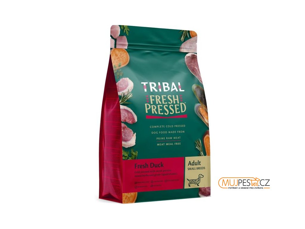 Receptura TRIBAL Fresh PressedTM Adult Small Breed Duck obsahuje 52 % čerstvé kachny, ryb a vajec + batáty, směs bylin, slávku zelenoústou a mnoho dalších hodnotných ingrediencí. Určená je především pro dospělé psy malých plemen.