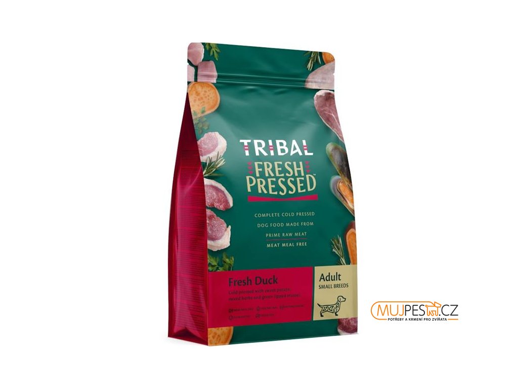 Receptura TRIBAL Fresh PressedTM Adult Small Breed Duck obsahuje 52 % čerstvé kachny, ryb a vajec + batáty, směs bylin, slávku zelenoústou a mnoho dalších hodnotných ingrediencí. Určená je především pro dospělé psy malých plemen.