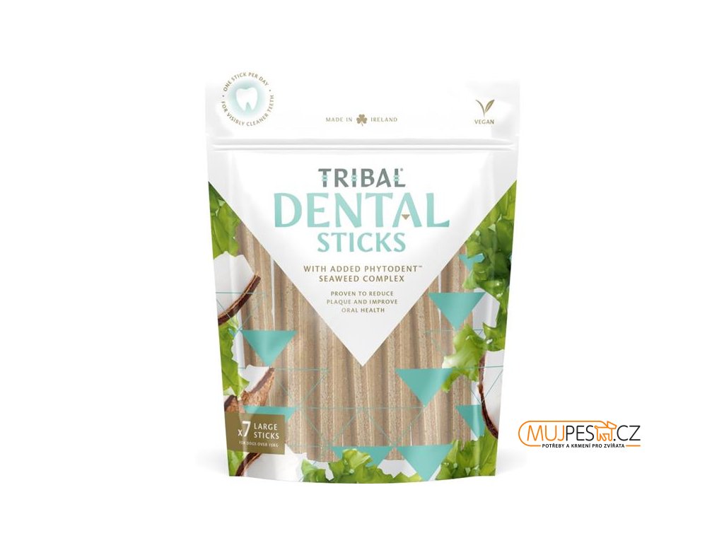 Tribal Dental Sticks Large jsou veganské tyčky s nízkým obsahem tuku vyrobené bez obilovin, přidaného cukru, umělých barviv a konzervačních látek. Jsou určené pro psy všech plemen od 15 kg a od 6 měsíců věku a jsou vhodné i pro psy s onemocněním štítné žlázy.